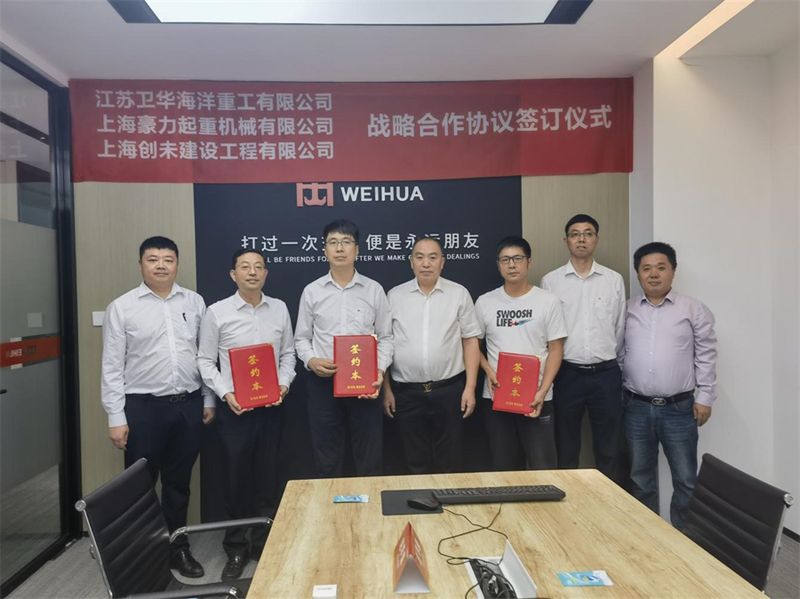 會議由河南衛華重型機械股份有限公司華東區總經理趙平康主持,上海創未建設工程有限公司總經理戴暉,江蘇衛華海洋重工有限公司副總經理魏軍偉等9人見證簽約儀式。