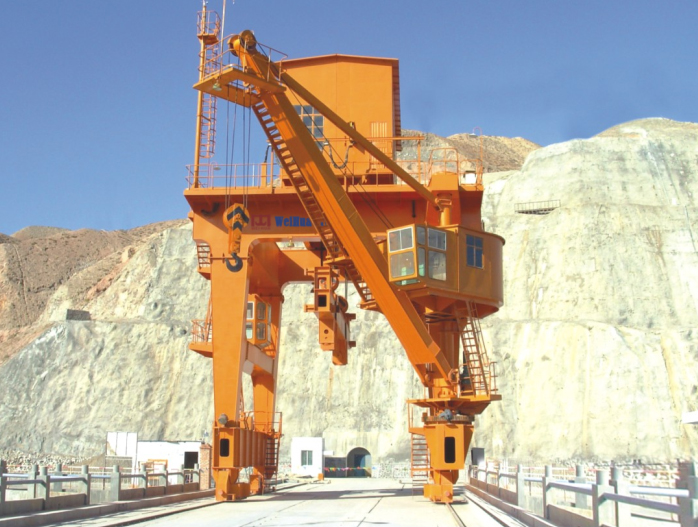雙向雙回轉(zhuǎn)門機(jī)與雙向門機(jī)類似。大車沿壩體方向運(yùn)動(dòng),小車沿水流方向運(yùn)動(dòng)。一般配有多套抓梁,可對壩上不同中心線上的多孔閘門及攔污柵進(jìn)行啟閉。門機(jī)上游或者下游支腿均配有回轉(zhuǎn)吊,每個(gè)回轉(zhuǎn)吊回轉(zhuǎn)半徑可達(dá)180°,可以輔助壩上設(shè)備的運(yùn)輸與安裝。