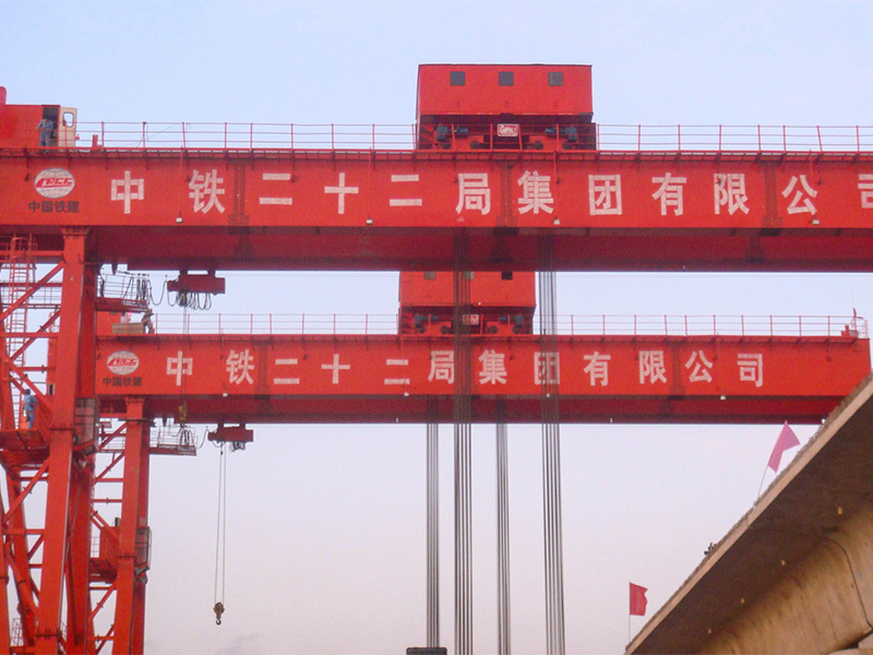 提梁機是一種為橋梁建設而專門設計的一種門式起重機。提梁機既可兩臺配合抬吊預制梁,也可以單臺起重機配雙吊具起吊預制梁,兩臺同時起重的提梁機各自的起重量一般為450噸,單臺起重的提梁機起重量通常可達900噸。它配置支腿行走、天車行走及天車起吊設備,可以實現全方位機械化動作。主要用于將預制梁從制梁臺提吊至存梁臺位,預制梁養護完成后將其從存梁臺位吊運到運梁車上。作為起重設備完成架橋機的組裝和拆卸。還用于架設墩身不高的旱橋。